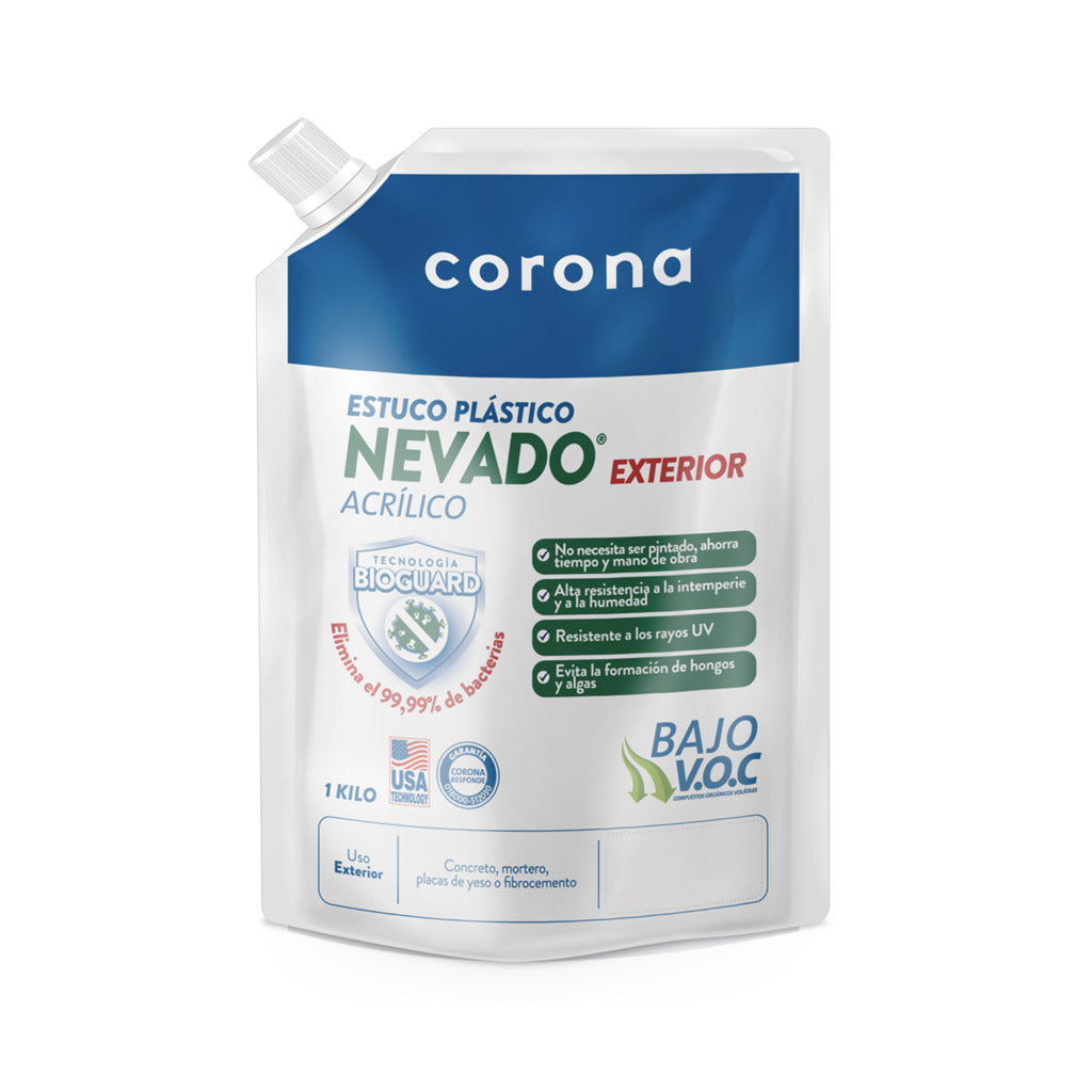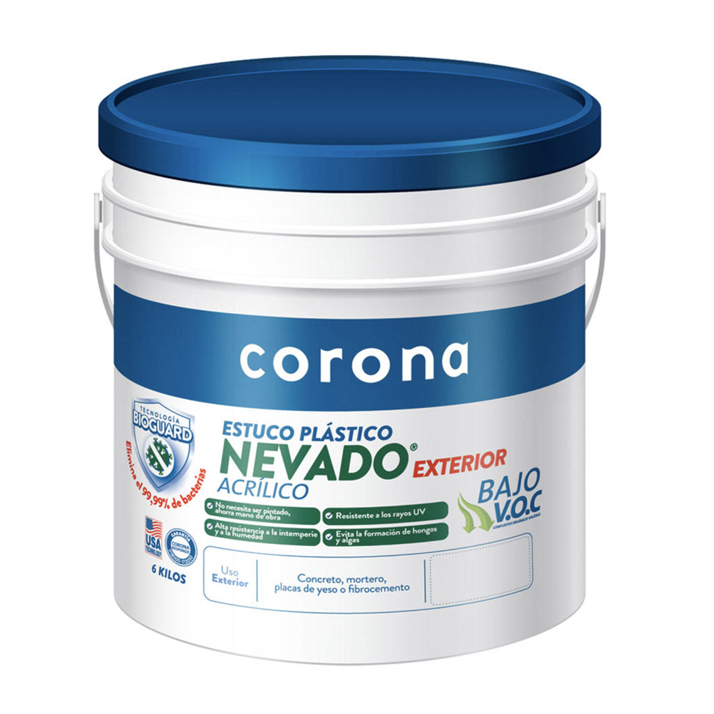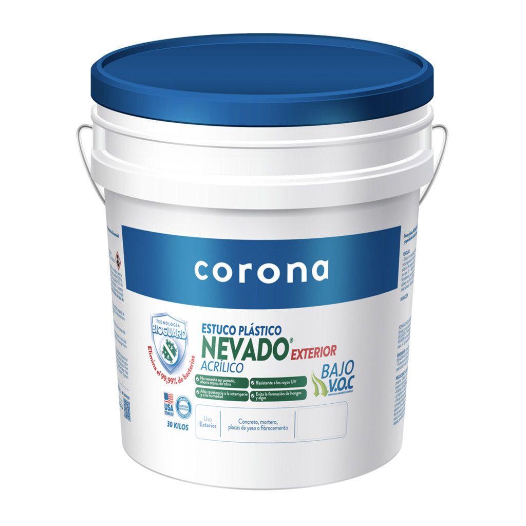 Instale la máxima protección exterior con el Estuco Plástico NEVADO EXTERIOR Acrílico de Corona. Este estuco de alto rendimiento no solo ofrece alta resistencia a la intemperie, la humedad y los rayos UV, sino que incorpora Tecnología Bioguard que elimina el 99.99% de las bacterias.